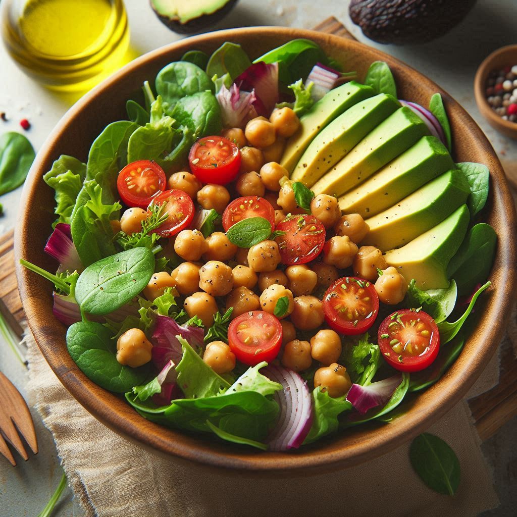 1. In a bowl, combine the chickpeas, avocado, mixed greens, and cherry tomatoes.