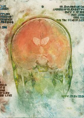 My etchings and digital collages express the beauty and mystery of the brain revealed through my own MRI images of my brain. Brain scans became a major part of my life when I was diagnosed with Multiple Sclerosis in 1992.